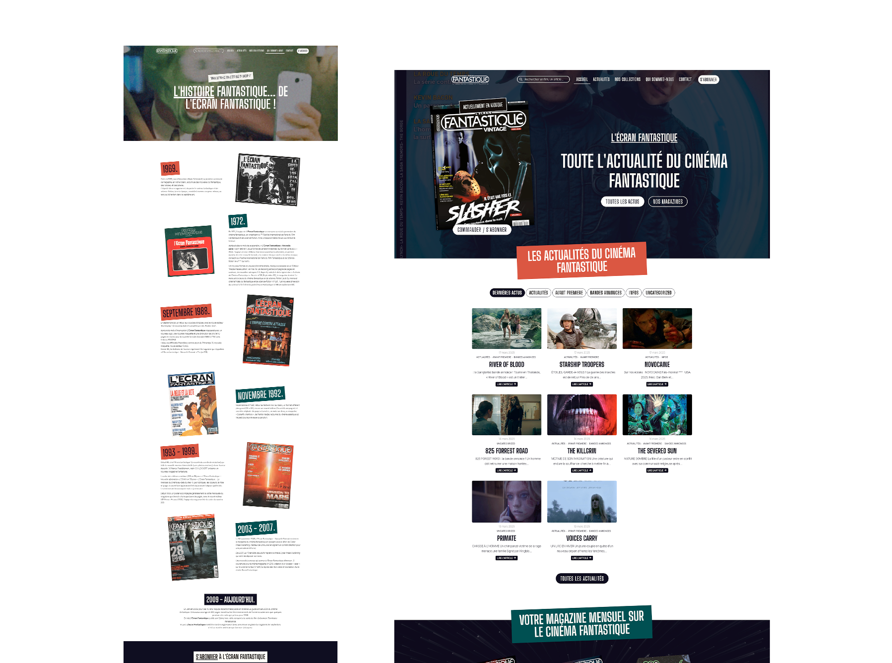 Refonte du site de l’Ecran Fantastique. Le site a principalement pour objectif la publication des dernières actualités du cinéma fantastique, gérée et rédigée par Alain Schlockoff. Les passionné(e)s du fantastique peuvent ainsi suivre toute l’actualité du fantastique entre deux sorties des magazines mensuels.
